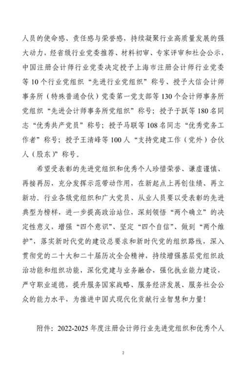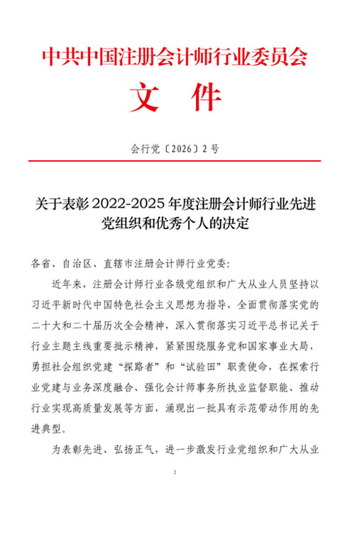 近日,收到中共中國注冊會計師行業(yè)委員會文件《關于表彰2022-2025年度注冊會計師行業(yè)先進黨組織和優(yōu)秀個人的決定》,我所主任會計師吳林海同志榮獲注冊會計師行業(yè)“優(yōu)秀黨務工作者”稱號。